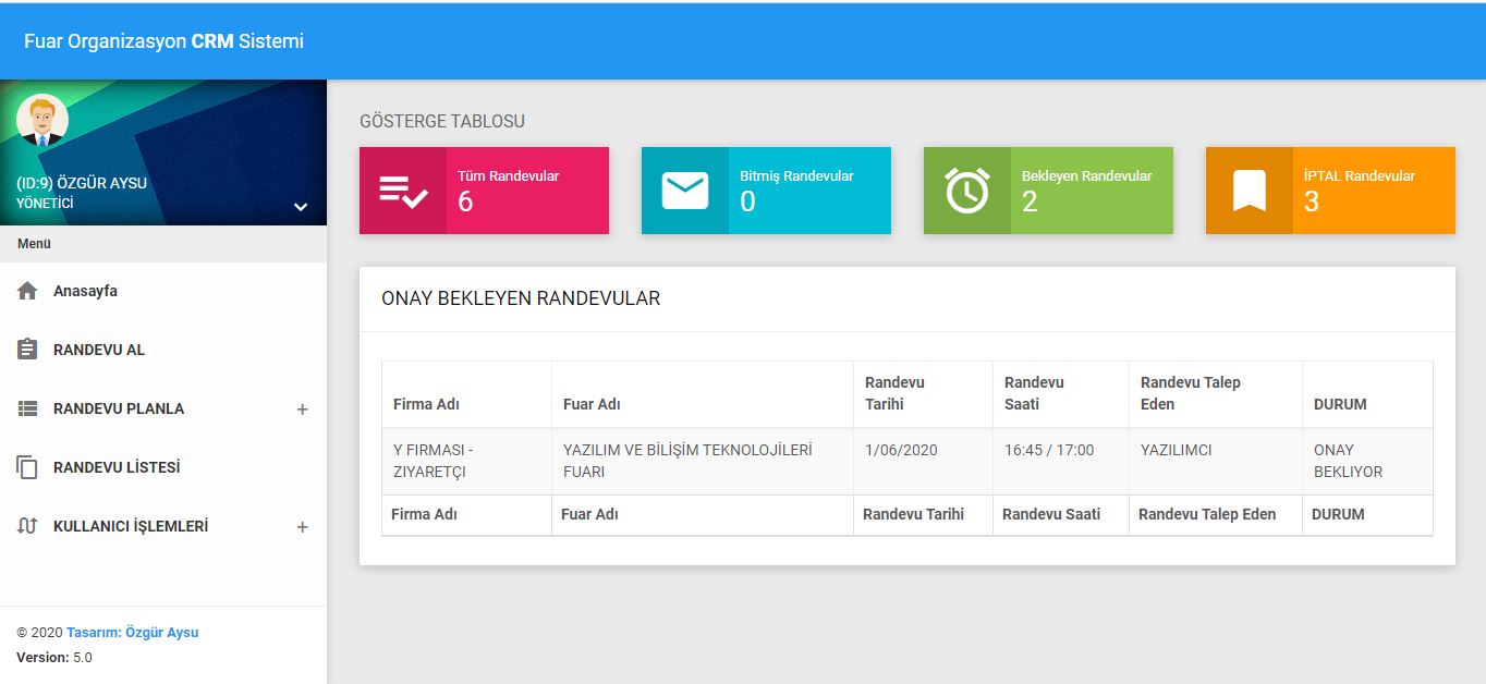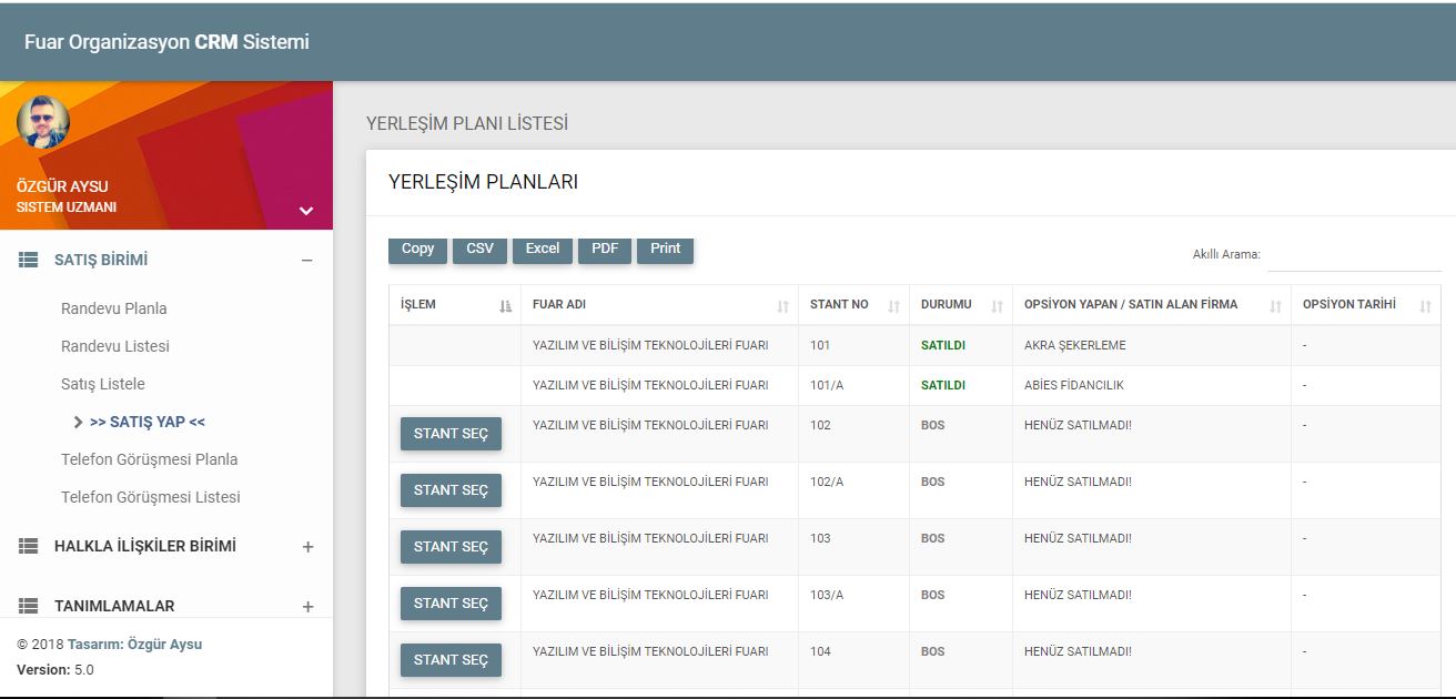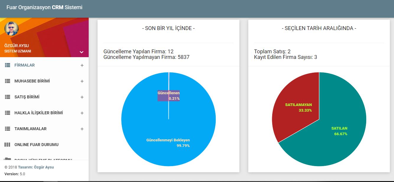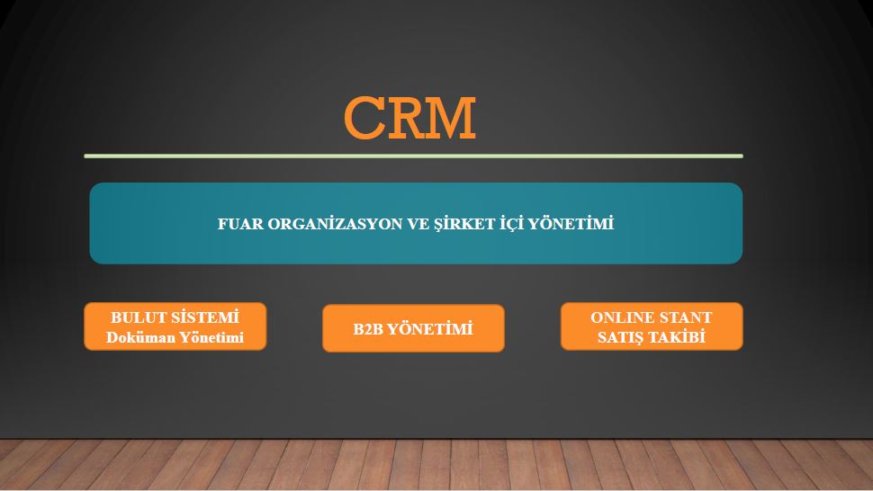 Fuar organizasyon firmalarına özel hazırlanmış geniş kapsamlı CRM projesidir. Firma içinde organizasyonel olarak takibi yapılması beklenen tüm husus düşünülmüş ve sürekli geliştirilmektedir. CRM projesine bağlı olarak B2B ikili randevulu görüşme sistemi, Online Davetiye Sistemi, Bulut Dosya Yükleme Platformu gibi modüller de mevcuttur. Satılan Stantların online olarak canlı canlı hangi firmaya satıldığını anlık görülebilir, satış detaylarına ulaşılabilir, ön muhasebe tutulabilir, istatiksel veriler çıkarılabilir, görev takibi, resmi iş takibi gibi bir çok iş sistem üzerinden yapılabilir. Excel programından kurtulmanın en iyi yolu...