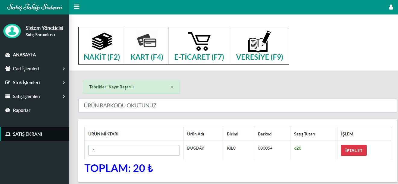 Menülerinden oluşan sistemde sisteme alış faturası işlendiğinde stok girişi yapılabilmekte, stoğu olan ürüne belirlenen tutarda satış yapıldığında otomatik olarak stoktan düşerek kar hesaplamakta, kısayol tuşları ile satış işlemi tamamlanabilmektedir. İlaveten kayıt edilmiş cariler üzerinden veresiyeli satış işlemi yapılarak veresiye takibi yapılabilmektedir.